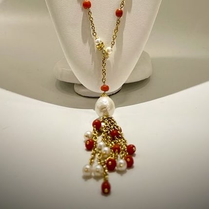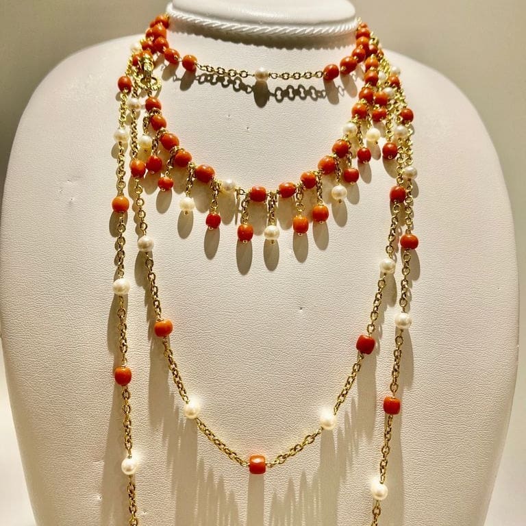Collane componibili e bracciale con ciondoli in argento dorato, corallo e perle naturali.